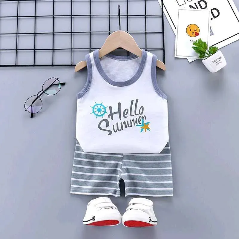 Conjunto ideal para el verano que incluye una camiseta y shorts a rayas para bebés de 9-12 meses. Esta ropa es perfecta para mantener fresco y cómodo a tu pequeño durante los días calurosos. ¡Haz que luzca a la moda con este conjunto de verano en El Salvador!